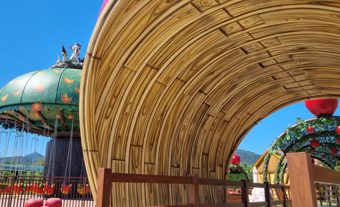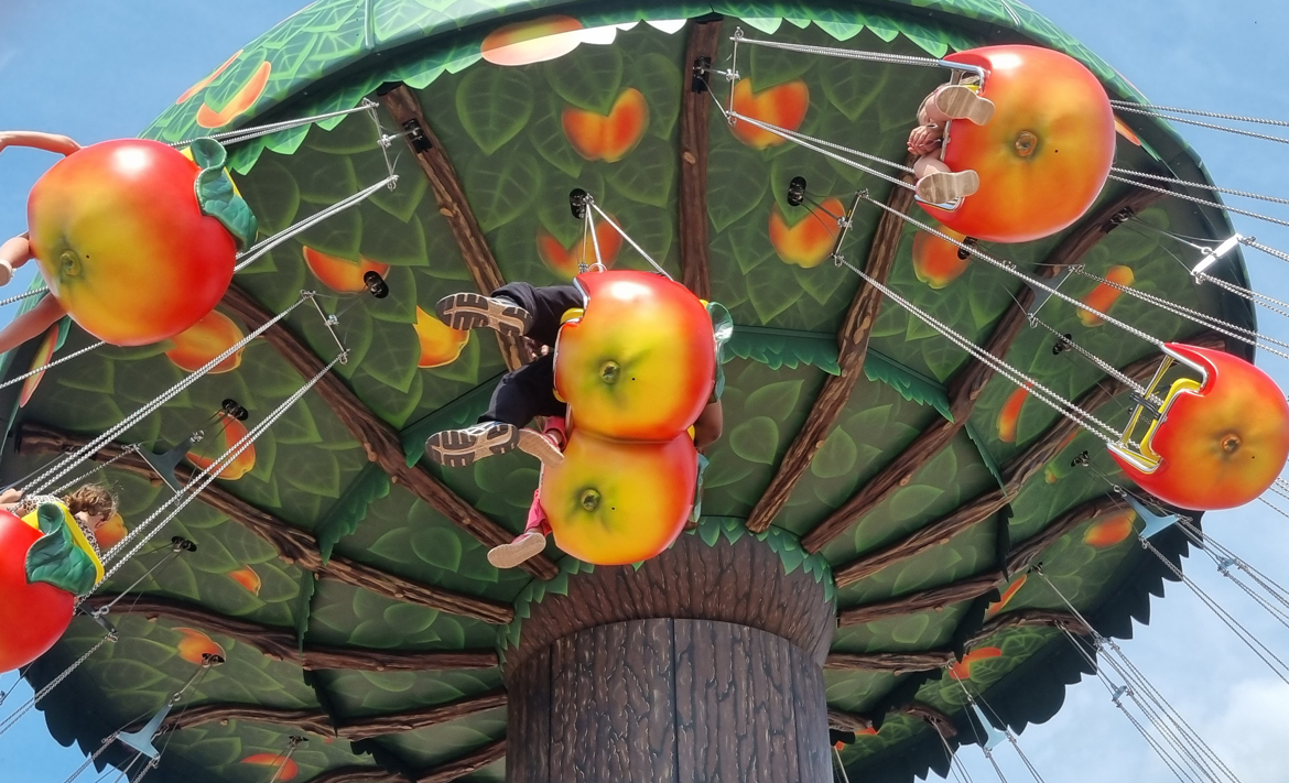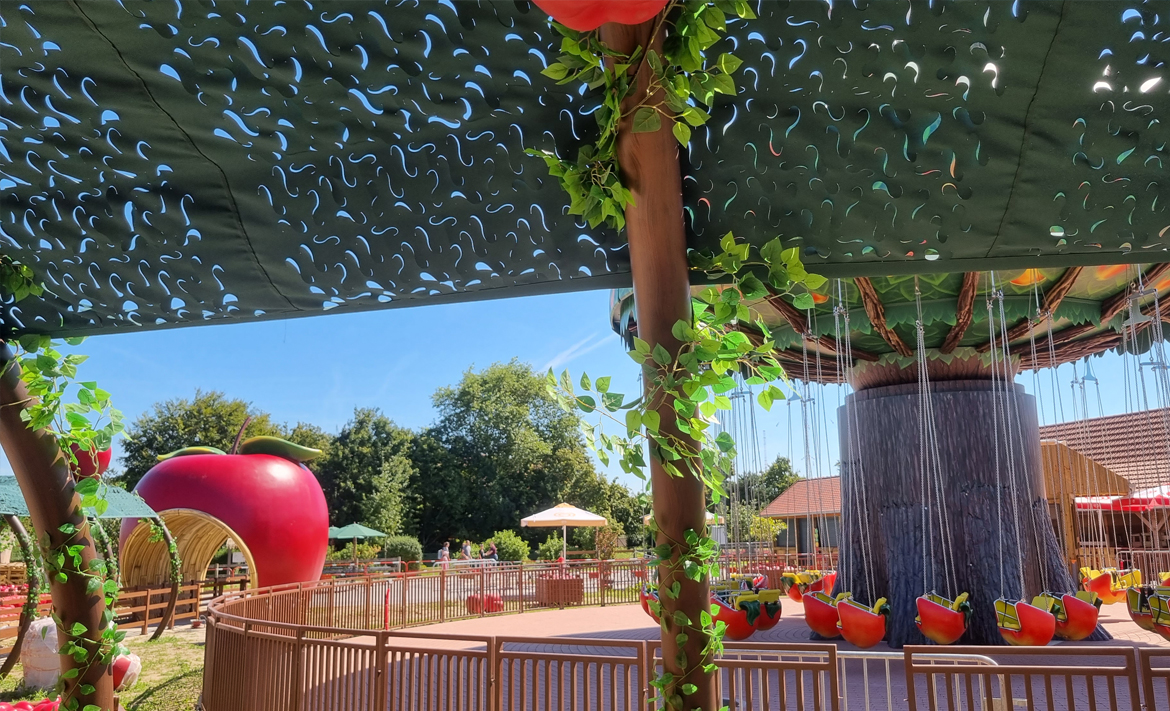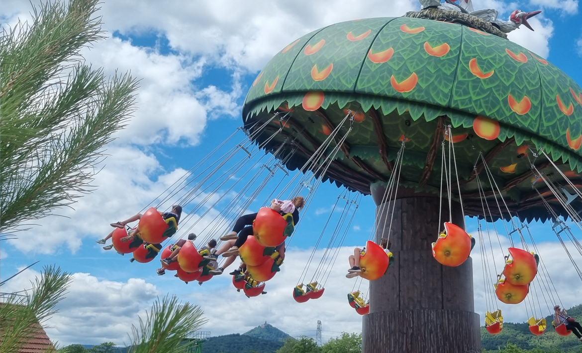 Autour de ses branches, 40 nacelles en forme de pomme s’élèvent et tourbillonnent, offrant des sensations uniques de vol et une vue imprenable sur le parc. Cette expérience inédite promet de ravir toute la famille, des plus jeunes aux plus grands.